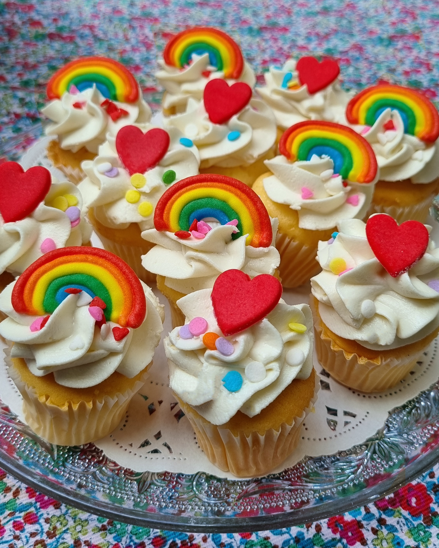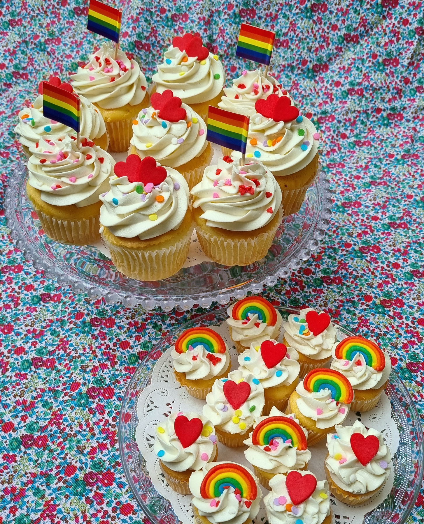 Add some fun and colour to your Pride celebrations with our adorable Sydney Mardi Gras Mini Cupcakes! Decorated with alternating Sugar Hearts and Rainbows, these cupcakes are fabulously festive and can be made with your choice of vanilla or chocolate cake.